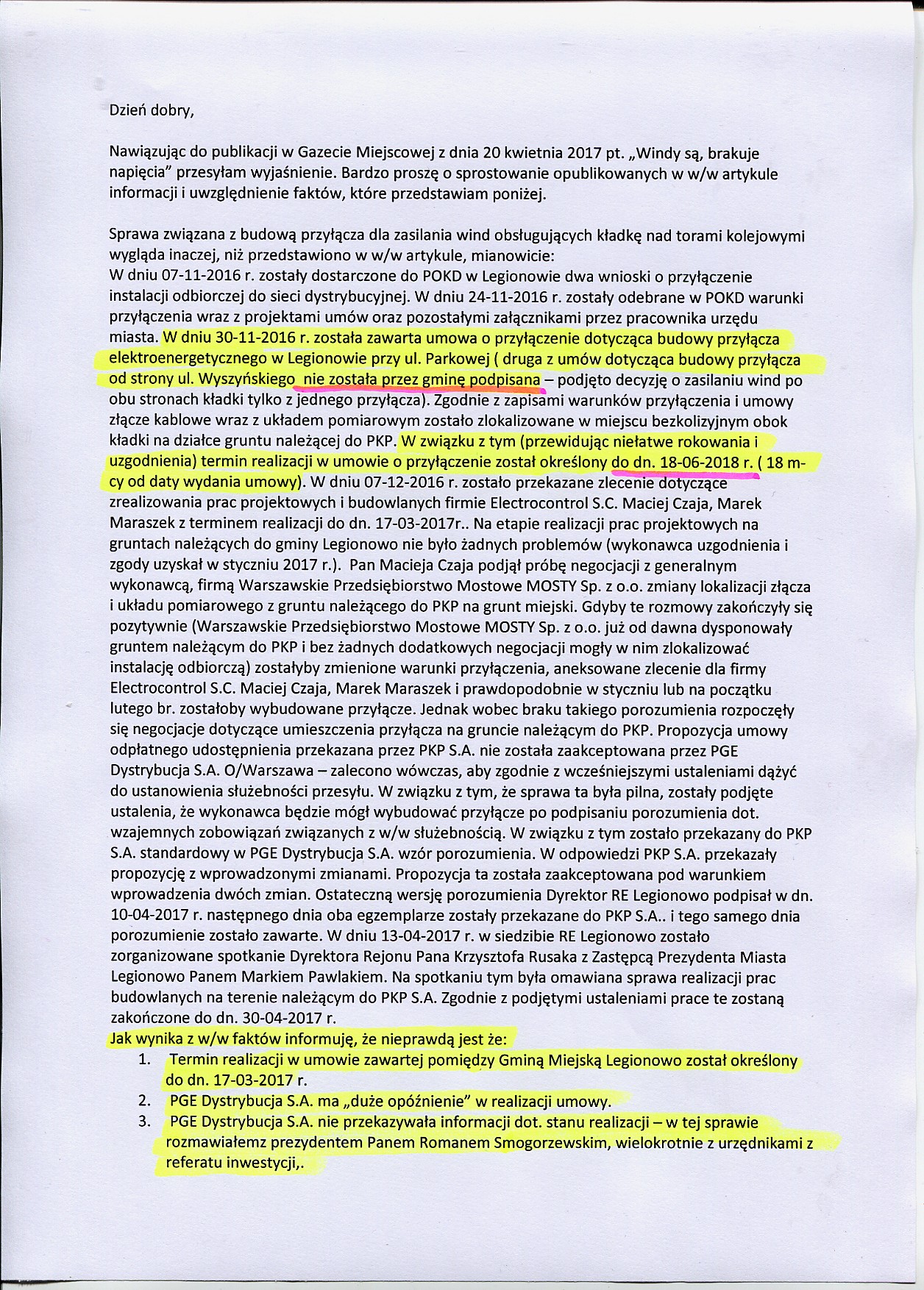 Jak nas poinformowano, 13 kwietnia odbyło się spotkanie dyrektora rejonu PGE Krzysztofa Rusaka z zastępcą prezydenta Legionowa Markiem Pawlakiem, na którym ustalono, iż wszelkie prace zostaną zakończone do 30 kwietnia 2017 roku. Adam Rafalski, rzecznik prasowy PGE odniósł się do artykułu w „Miejscowej” i poprosił o sprostowanie nieprawdziwych informacji. Napisał m.in., że nieprawdą jest, iż termin realizacji w umowie zawartej z miastem został określony do dnia 17 marca oraz , że PGE Dystrybucja ma duże opóźnienie. – Nie prawdą też jest, że PGE Dystrybucja nie przekazywała informacji dotyczącej stanu realizacji, gdyż w tej sprawie rozmawiałem z prezydentem Romanem Smogorzewskim, wielokrotnie z urzędnikami z referatu inwestycji – poinformował Adam Rafalski.