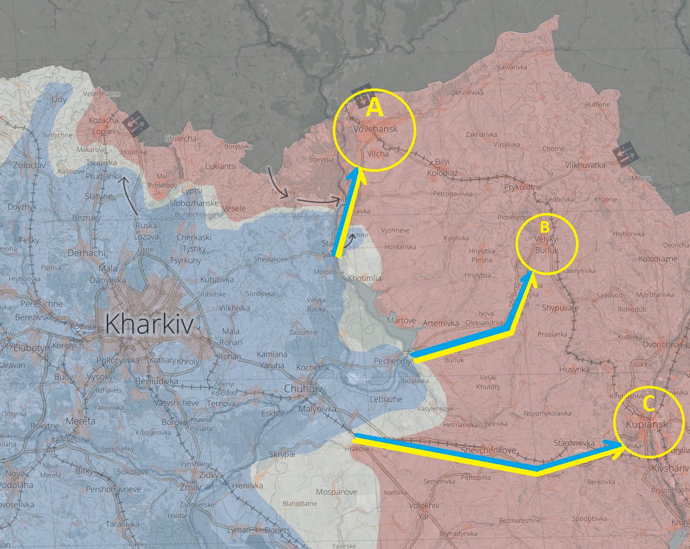 Udana obrona jednego z największych miast kraju, jak i jednego z głównych celów rosyjskiej agresji to ogromny sukces Kijowa. Niemniej, to działania na wschód od stolicy obwodu charkowskiego niosą jeszcze większe implikacje strategiczny. Podejście pod rzekę Doniec oraz jej przekroczenie i formowanie dalszych działań ofensywnych przez ukraińską armię mogą poważnie zagrozić rosyjskim wojskom. Jeżeli bowiem Ukraińcom udałoby się dojść i odbić Wowczańsk (mapa 2, pkt A), Wełykij Burłuk (pkt B) lub (szczególnie) Kupiańsk (pkt C), przecięliby główny szlak logistyczno-komunikacyjny rosyjskiego zgrupowania w okolicach Iziumu oraz Sewierodoniecka/Łysyczańska. Przez te miasta przechodzi bowiem większość transportów sprzętu, amunicji i broni agresora do jego jednostek na froncie.