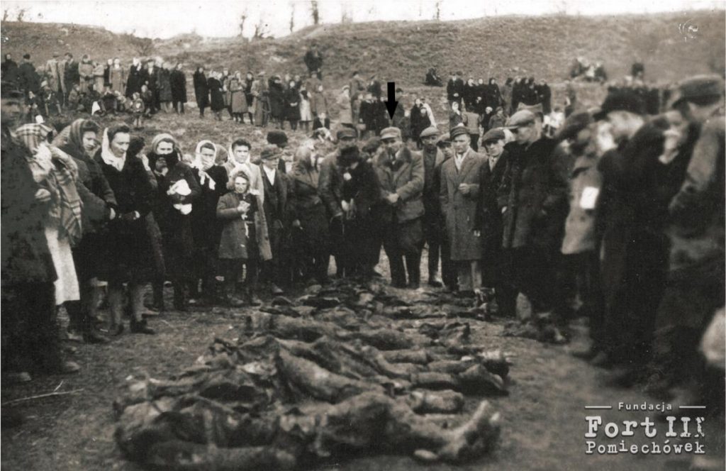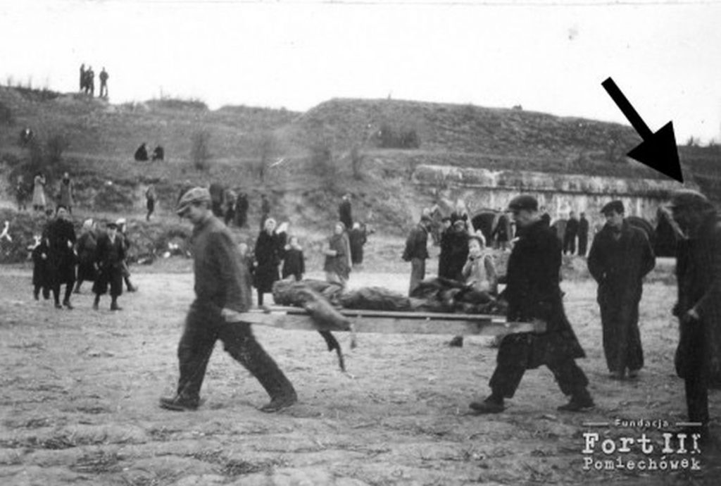 Pan Bogumił rozpoznał na dwóch zdjęciach z ekshumacji z 1945 r. swojego ojca (zdjęcia powyżej – oznaczony strzałką) oraz ciało wuja Piotra leżące na noszach (zdjęcie obok). Za marami idzie Władysław Kopański (zaznaczony strzałką). Pan Bogumił powiedział, że widział ciało wujka po przywiezieniu z Fortu. Rodzina zakryła Piotrowi głowę suknem, żeby dzieciom oszczędzić widoku. Kula, która przeszła przez potylicę roztrzaskała czoło. Poza tym, ciało było bez dużych oznak rozkładu. Buty bardzo dobrze zachowane, takie same jak na pomniku.