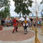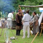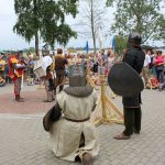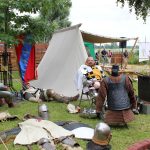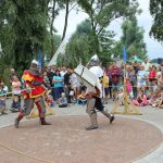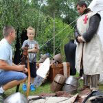 Warsztatom towarzyszyły pokazy walk rycerskich. Przedstawiciele średniowiecznego rycerstwa kilkukrotnie starli się z sobą w emocjonujących, ciężkich walkach. Same stroje, w których członkowie grupy rekonstrukcyjnej chodzili od rana, składały się z kilku grubych warstw materiałów, a niektórzy dodatkowo mieli jeszcze metalowe zbroje. Bez wątpienia było im więc gorąco i pewnie mało komfortowo. Ale dzielni rycerze wprawieni są też w bojach z temperaturą, od wielu lat bowiem biorą udział w różnego rodzaju przedsięwzięciach „rycerskich”, a i do nas przyjechali prosto spod Grunwaldu. W tym roku, w Serocku, po raz pierwszy gościła grupa rekonstrukcyjna Templum Temploris. Woj Hubert przybliżył publiczności nie tylko historię Polski, ale przede wszystkim opowiedział o zwyczajach rycerskich, strojach z poszczególnych epok, czy walkach, w jakich polscy rycerze brali udział. Zapraszał do przymierzania strojów i broni w rozbitym obozowisku, gdzie rycerze odpoczywali po walkach.
