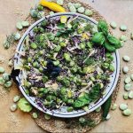 Bób kojarzy mi się z ciepłymi, letnimi wieczorami ze znajomymi, gdzie każdy skubał świeżo ugotowany bób. Sama w ten sposób potrafię zjeść całą miskę. Dzisiaj coś dla miłośników sałatek. Bób z czerwona kapustą z bazyliowo – koperkowym sosie. Wykorzystałam też młode cukinie z ogródka