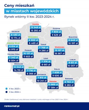 Rosnącym cenom mieszkań w Polsce nikt się już nie dziwi, a zaskoczenie może powodować jedynie skala podwyżek. Co ciekawe, w miastach wojewódzkich z tzw. najwyższej półki cenowej stawki za 1m2 mieszkania gwałtownie rosną, a w tych uznawanych za względnie tanie wzrosty są minimalne. Eksperci multiporównywarki rankomat.pl przeanalizowali ceny mieszkań na podstawie na podstawie średnich stawek ofertowych w II kw. 2024 r. na rynku pierwotnym i wtórnym w 18 miastach wojewódzkich. Porównanie dotyczy okresów I kw. 2024 r. oraz II kw. 2024 r. Dane pochodzą z bazy portali z branży nieruchomości – RynekPierwotny.pl i GetHome.pl.