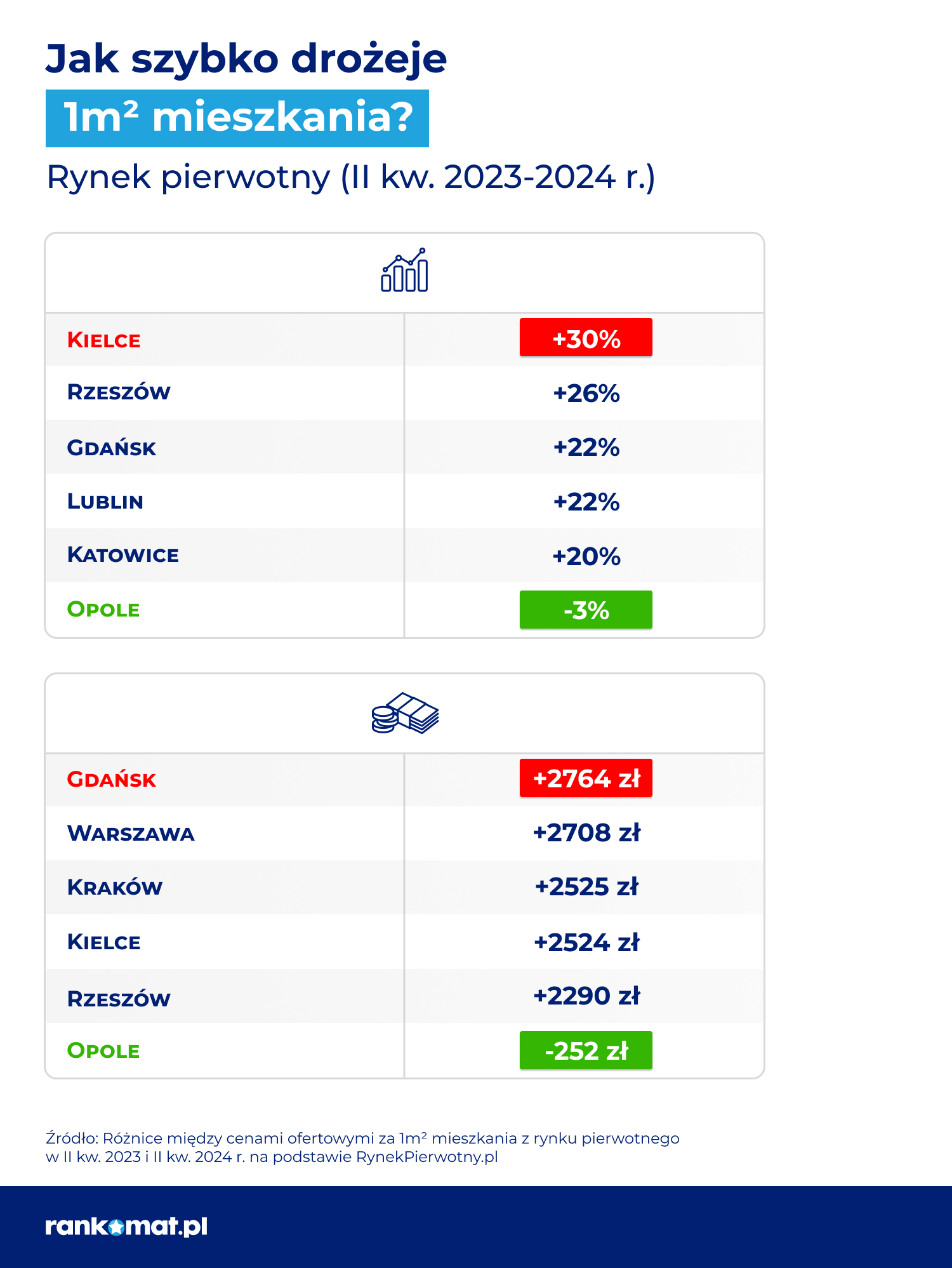 (+20%). Z kolei najwolniej w ciągu 12 miesięcy drożały nowe mieszkania w Szczecinie, Białymstoku i Zielonej Górze (+6-7%), a w dwóch miastach stawki nawet spadły. Kwotowo najbardziej przez rok zdrożały mieszkania w Gdańsku (o 2 764 zł na 1m2), a w Opolu potaniały (o 252 zł na 1m2).