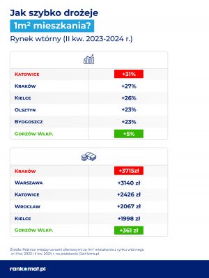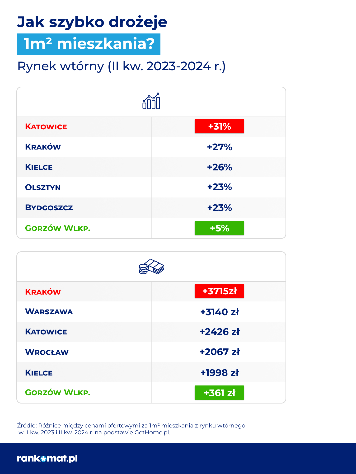 Na rynku wtórnym procentowo 1m2 mieszkań najbardziej zmienił się w Katowicach (+31%), Krakowie (+27%), Kielcach (+26%) oraz Bydgoszczy i Olsztynie (+23%). Najmniej przez rok rosły stawki w Gorzowie Wlkp., Rzeszowie i Opolu (maksymalnie +8%), a także w Gdańsku i Poznaniu (+15%). Kwotowo gigantyczny skok zanotował Kraków (o 3715 zł na 1m2), a najmniejsza różnica w ciągu 12 miesięcy wystąpiła w Gorzowie Wlkp. (o 361 zł na 1m2).
