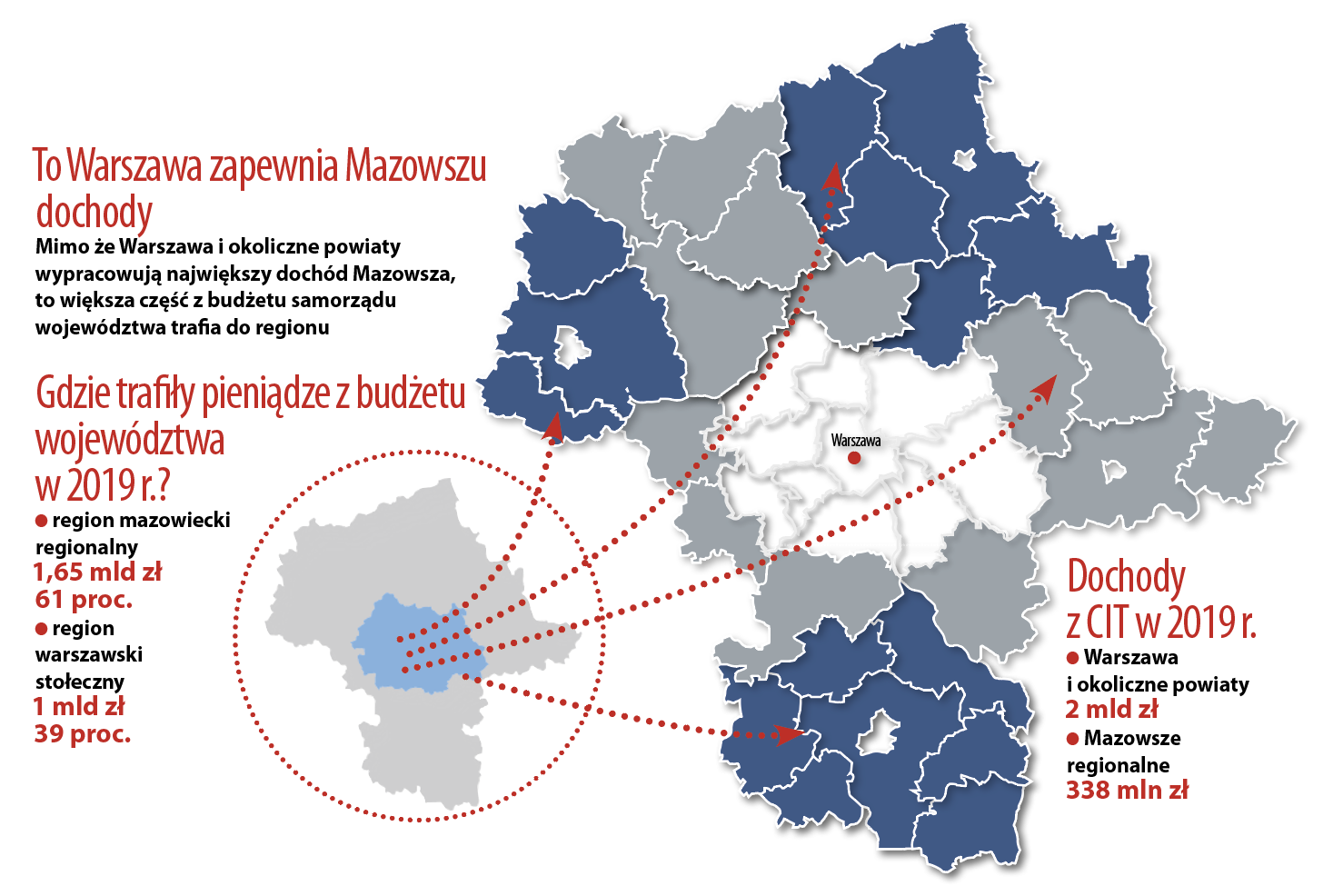 Mazowsze bez serca, czyli bez centralnej części – Warszawy i okolicznych powiatów, nie będzie mogło pozwolić sobie na tak ważne dla mieszkańców wsparcie. A to właśnie stolica z obwarzankiem generuje wysokie dochody regionu. Jak wynika z analiz urzędu marszałkowskiego, firmy z aglomeracji warszawskiej zapewniają aż 87 proc. dochodów województwa z podatku CIT. To właśnie w stolicy i sąsiadujących powiatach jest w sumie 75 proc. firm krajowych i zagranicznych! Są one impulsem rozwojowym Mazowsza. Najważniejszy dochód województwa, czyli podatek CIT, wyniósłby w nowym województwie zaledwie 13 proc. obecnych wpływów z tego tytułu.