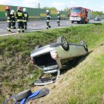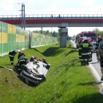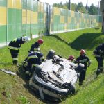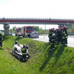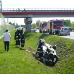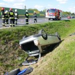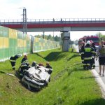 Strażacy po przyjeździe na miejsce zdarzenia zastali leżący w głębokim rowie samochód. Otóż okazało się, że jadące Drogą Krajową 61 w kierunku Serocka audi w miejscowości Borowa Góra chciało skręcić w prawo na Jadwisin. W pewnym momencie w pojeździe pękła przednia opona od strony pasażera, a samochodem gwałtownie „szarpnęło”. Z relacji kierowcy wynika, że nie miał on szans na żadną reakcję pomimo, że prędkość miał już niedużą. Audi z impetem wpadło do głębokiego rowu, wcześniej ścinając przydrożny słupek, by finalnie wylądować na dachu. Na szczęście, około 35-letni kierowca audi wraz z jadącą jako pasażerka córką wydostali się na zewnątrz poprzez otwarty bagażnik. Nikomu nic się nie stało. W akcji uczestniczyły 3 zastępy JRG Legionowo, OSP Serock i Wojskowa Straż Pożarna z Zegrza. Samochód wydostano z rowu i postawiono na kołach na poboczu. Kierowca został ukarany mandatem karnym w wysokości 250 zł.