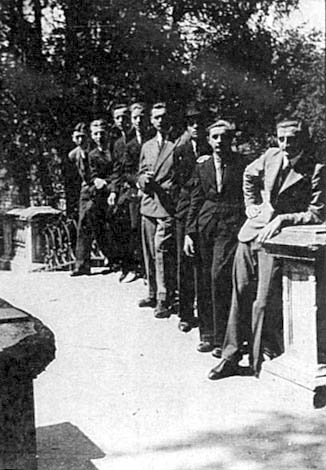 Ryszard Gubała z bratem i kolegami na kilkanaście dni przed wybuchem wojny przy pomniku Sobieskiego w Łazienkach Królewskich. Od prawej stoją: Kazimierz Gubała, Ryszard Gubała, Aleksander Cesarski, Edward Gołowiak, Roman Kuczarowski, NN, Edward Truszkowski, Jan Jaszczuk