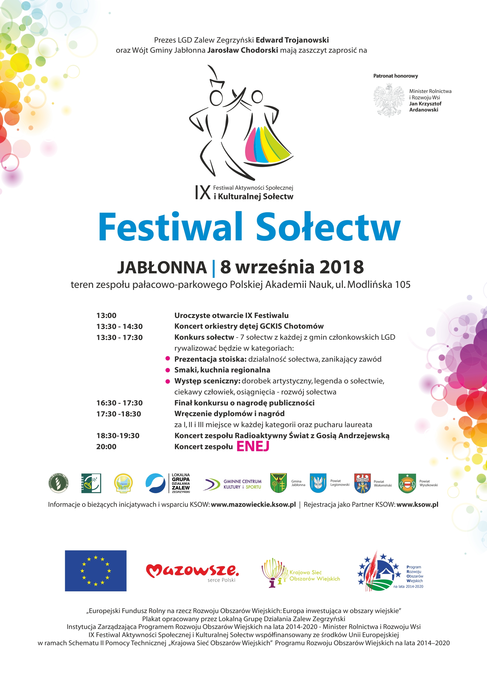 Już dziś (8.09) o godzinie 13.00 na terenie zespołu pałacowo-parkowego PAN przy ul. Modlińskiej 105 w Jabłonnie odbędzie się IX Festiwal Aktywności Społecznej i Kulturalnej Sołectw