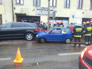 Kierujący pojazdem marki Fiat Seicento, 24-letni mężczyzna nie dostosował prędkości do warunków panujących na drodze i wjechał w tył zaparkowanego na chodniku Mercedesa należącego do firmy pogrzebowej. W wyniku kolizji nikomu nic się nie stało. Na miejscu interweniowała policja. Za spowodowanie kolizji, 24-latek został ukarany mandatem karnym.