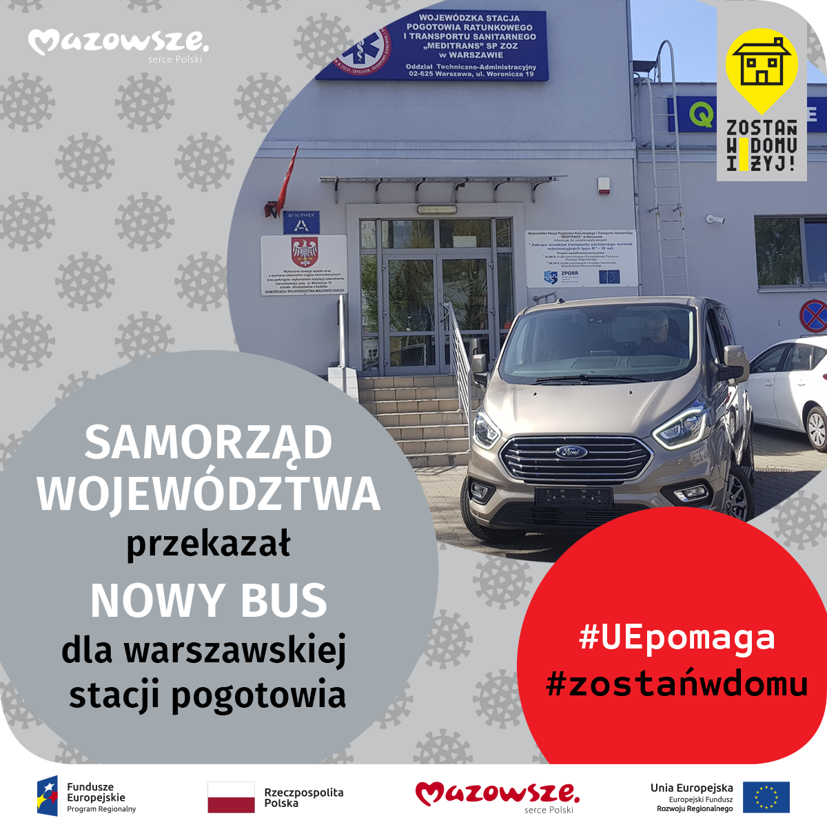 Samorząd Mazowsza dzięki wsparciu Unii Europejskiej zakupił 5 busów do przewozu osób zakażonych, niewymagających opieki medycznej. Trafiły one do stacji pogotowia w Siedlcach, Ostrołęce, Płocku, Warszawie i Radomiu.
