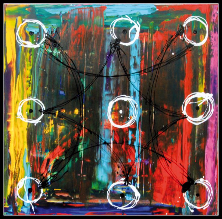 (PZ) Mam dwa zasadnicze nurty tematyczne . Z jednej strony wspomniane już maski lub też tzw. gęby. Niedoścignionym wzorem jest tu twórczość wielkich klasyków takich jak: Jean-Michel Basquiat czy Francis Bacon. A drugi to nurt abstrakcyjny odnoszący się do świata fizyki tej dużej kosmicznej i tej małej w mikro skali, wielkości atomu, glonu, fotonu etc.