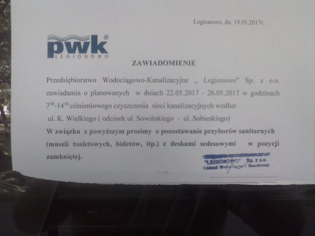 W dniu dzisiejszym (19.05) Przedsiębiorstwo Wodno-Kanalizacyjne w Legionowie, rozkleiło w legionowskich blokach informację na temat planowanego ciśnieniowego czyszczenia sieci kanalizacyjnej w dniach 22.05-26.05.2017 r.