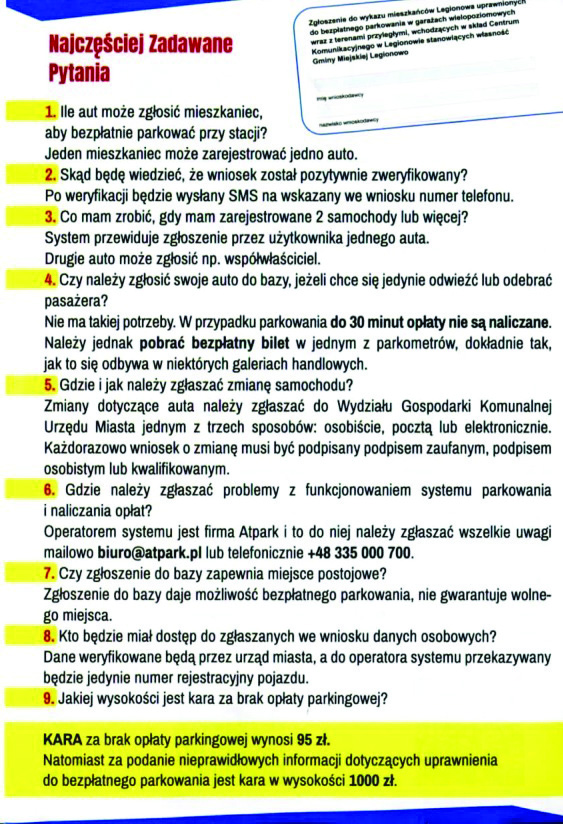 Mieszkańcy Legionowa, którzy nie chcą płacić za korzystanie z parkingu powinni złożyć odpowiedni wniosek do Urzędu Miast: osobiście, drogą pocztową lub elektronicznie. Dwie pierwsze możliwości wymagają podpisu osobistego, natomiast wniosek elektroniczny musi zawierać podpis kwalifikowany lub wykonany za pomocą profilu zaufanego. Co ważne, urząd operatorowi systemu parkingowego przekaże jedynie numer rejestracyjny auta. Pozostałe dane służą wyłącznie do weryfikacji wniosku.