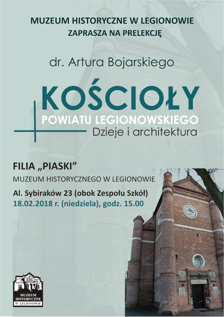 W niedziele 18 lutego o godzinie 15:00 w Muzeum Historycznym w Legionowie filia “Piaski” przy Al. Sybiraków 23 (obok Zespołu Szkół) odbędzie się prelekcja dr. Artura Bojarskiego – Kościoły Powiatu Legionowskiego
