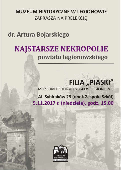Już w niedziele 5 listopada o godzinie 15:00 w Muzeum Historycznym w Filii “Piaski” przy ulicy Sybiraków 23 odbędzie się prelekcja dr. Adama Bojarskiego pt: “Najstarsze Nekropolie powiatu legionowskiego” WSTĘP WOLNY!