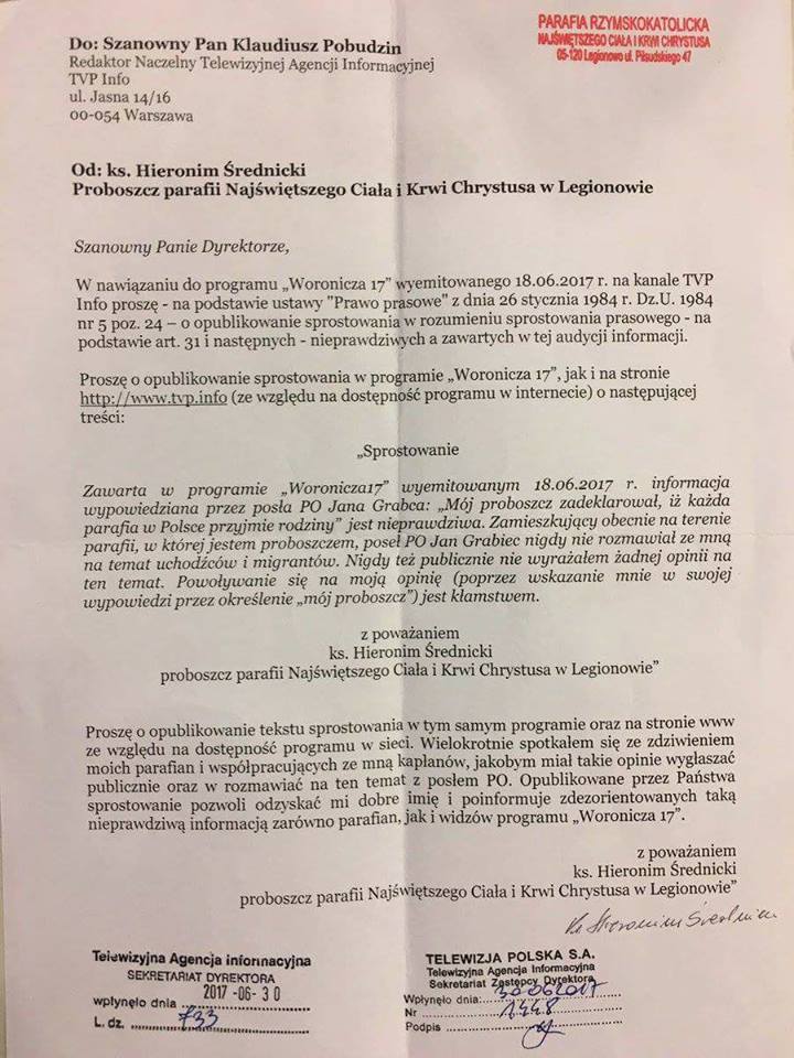 Ksiądz Hieronim Średnicki, proboszcz parafii Najświętszego Ciała i Krwi Chrystusa w Legionowie skierował sprostowanie do redaktora naczelnego Telewizyjnej Agencji Informacyjnej TVP Info. Chodziło o wypowiedź legionowskiego posła Jana Grabca w programie „Woronicza 17”, wyemitowanego w telewizji 18 czerwca br.
