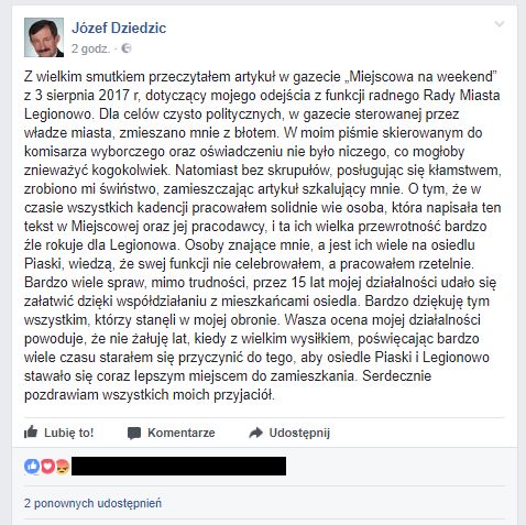 W czwartek (17.08) około godziny 19:00 na profilu legionowskiego radnego Józefa Dziedzica, pojawiło się oświadczenie w sprawie artykułu w propagandowej gazecie ratusza “Miejscowa na Weekend” dotyczące jego odejścia z funkcji radnego w radzie miasta i oceny jego pracy