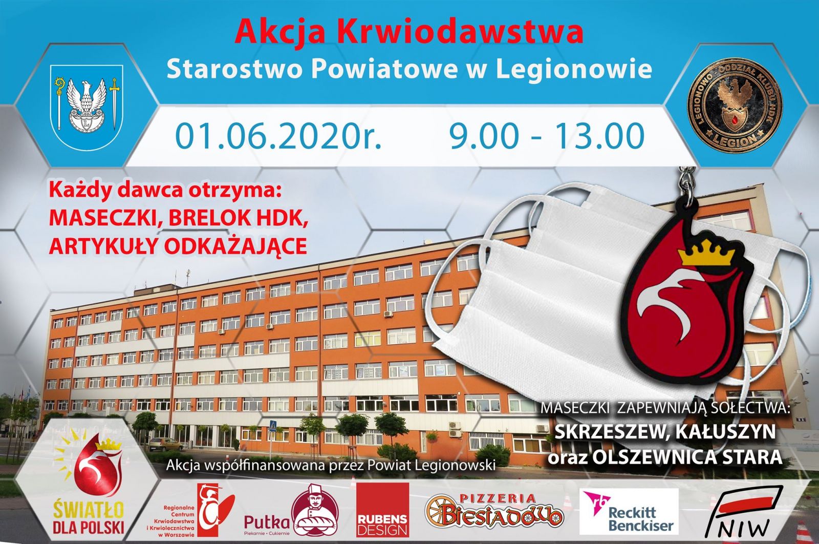 Organizatorami akcji krwiodawstwa są Stowarzyszenie Honorowych Dawców Krwi „Legion” i Powiat Legionowski w ramach zadania publicznego pn. „Krzewienie idei krwiodawstwa wśród mieszkańców Powiatu Legionowskiego w 2020 r.”