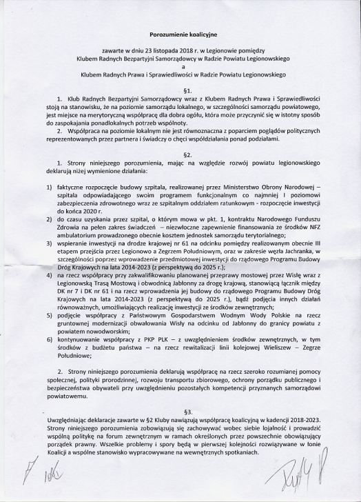 Podczas dzisiejszej (23 listopada) sesji Rady Powiatu Legionowskiego Bezpartyjni Samorządowcy (BS) starosty Roberta Wróbla zawarli porozumienie koalicyjne z radnymi Prawa i Sprawiedliwości (PiS).