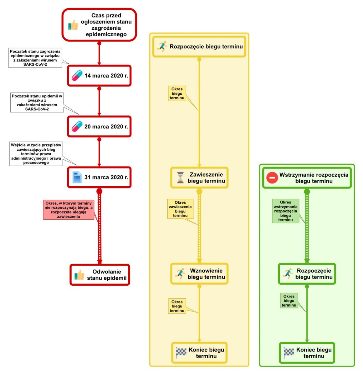 • wstrzymanie i zawieszenie terminów procesowych oraz prawa administracyjnego obowiązuje dopóki obowiązuje stan epidemii lub stan zagrożenia epidemicznego (patrz infografika).
