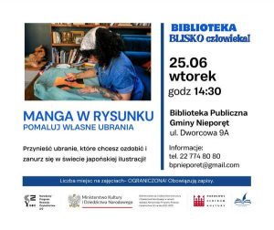 2024-06-14 1:01:0025.06.24r. o godz. 14:30 w Bibliotece Publicznej Gminy Nieporęt odbędą się wyjątkowe warsztaty literacko-artystyczne. Uczestnicy będą mieli okazję ozdobić własne ubrania, inspirując się japońską ilustracją mangi. Warsztaty są częścią projektu “Biblioteka BLISKO człowieka” i skierowane są do wszystkich – zarówno pojedynczych osób, jak i całych rodzin. Ze względu na ograniczoną liczbę miejsc, obowiązują zapisy.