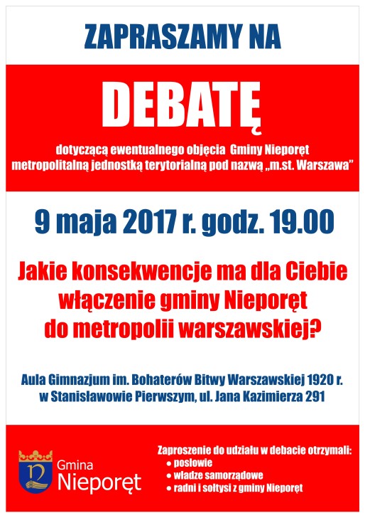 Tematem debaty będzie :Jakie konsekwencje ma dla Ciebie włączenie gminy Nieporęt do metropolii warszawskiej. Zaproszenie do udziału w debacie otrzymali posłowie, władze samorządowe oraz radni i sołtysi z gminy Nieporęt