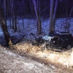 Kobieta, która prowadziła forda straciła panowanie nad pojazdem zawadzając o przejeżdżającego obok volkswagena golfa i uderzając w drzewo, a finalnie zatrzymując się w przydrożnym rowie. Działania zastępów straży polegały na zabezpieczeniu miejsca zdarzenia, odłączeniu akumulatora oraz pomocy zespołowi pogotowia ratunkowego w przeniesieniu poszkodowanej do karetki. Kierująca z urazem głowy została zabrana do szpitala. Kierowca volkswagena nie odniósł żadnych obrażeń. Ruch na drodze odbywał się bez większych przeszkód. W akcji trwającej nieco ponad 1 godzinę wzięły udział dwa zastępy z JRG Legionowo i jedne z Wojskowej Straży Pożarnej w Zegrzu.