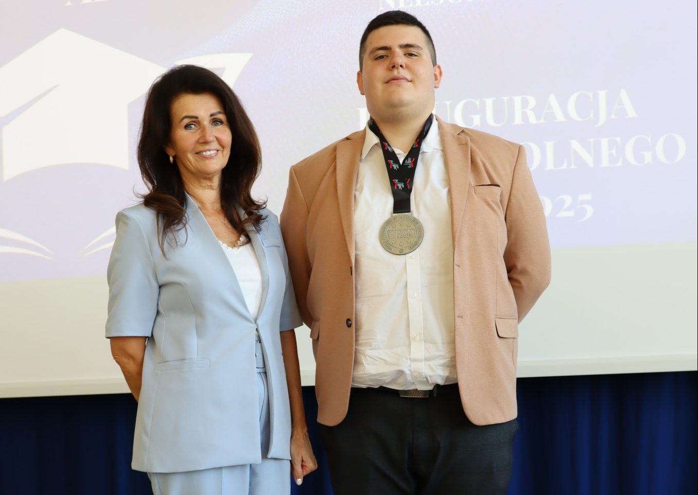 Dyrektor Ewa Leszczyńska i uczeń Alan Szajczyk – wicemistrz świata w kickboxingu
