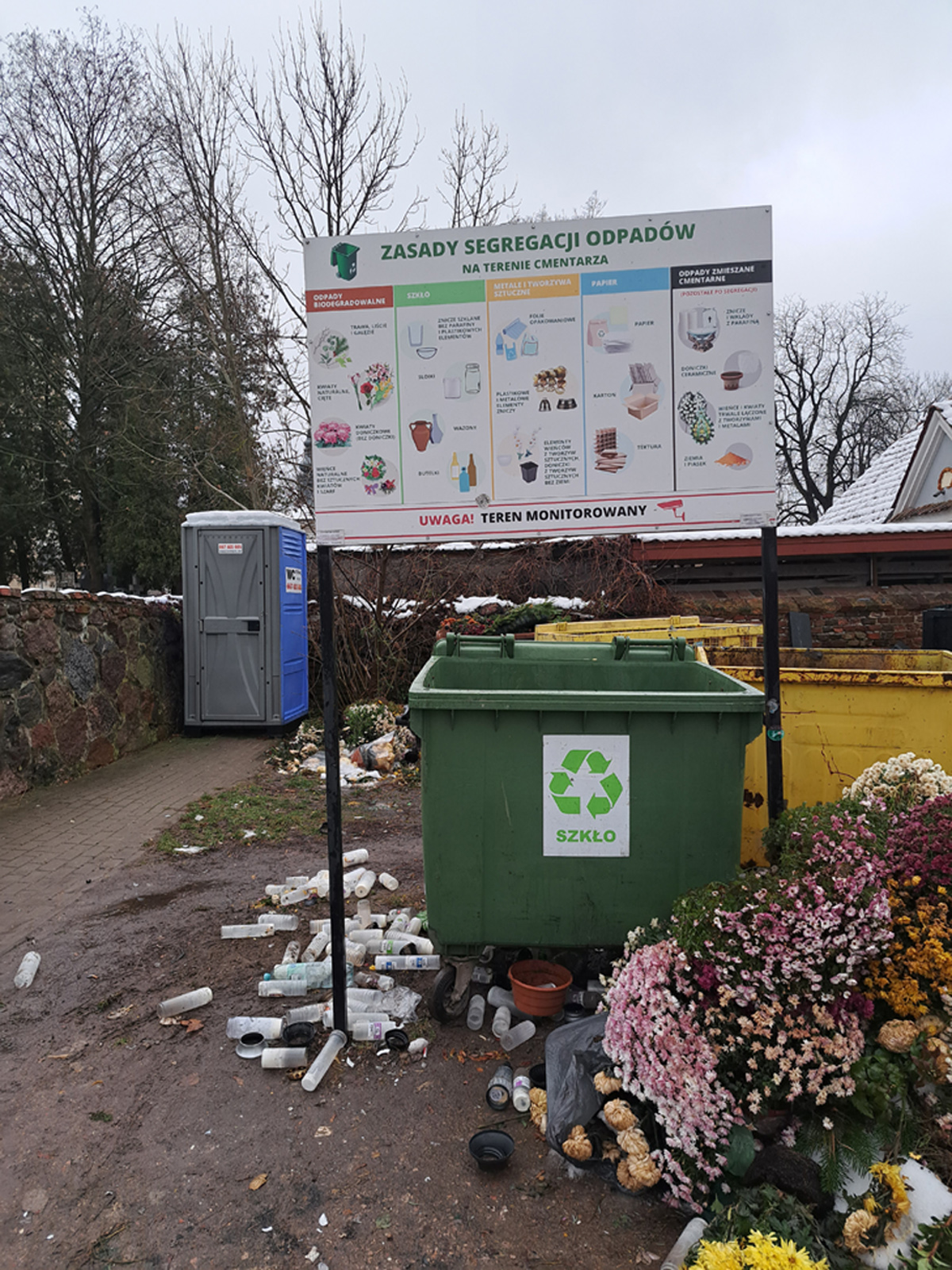 Administratorem cmentarza św. Krzyża jest proboszcz parafii ks. Janusz Zdunkiewicz. Z rozmowy z nim wynikają pewne optymistyczne wnioski. Otóż, za cmentarne śmieci w październiku 2022 roku zapłacił prawie 24 000 zł, natomiast w tym roku była to już kwota ok. 16 500 zł. Wygląda na to, że mniej szkodliwych dla środowiska i klimatu odpadów przyniesiono na groby. Czy jest to wynik większej świadomości odwiedzających cmentarz bliskich czy bardziej drożyzny? Trudno powiedzieć. Ksiądz, podobnie jak ci z innych parafii, stara się edukować z ambony, apelując by ograniczać ilość zniczy i sztucznych kwiatów. Za naszym pośrednictwem prosi też, by starać się prawidłowo segregować to co wyrzucamy do kontenerów na cmentarzu. Dotyczy to chociażby doniczek z chryzantemami. Powinny być oddzielane od kwiatów i wrzucane do plastiku.