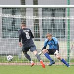 Bramkarz Adam Radzikowski w pojedynku z Andrzejem Trubehą