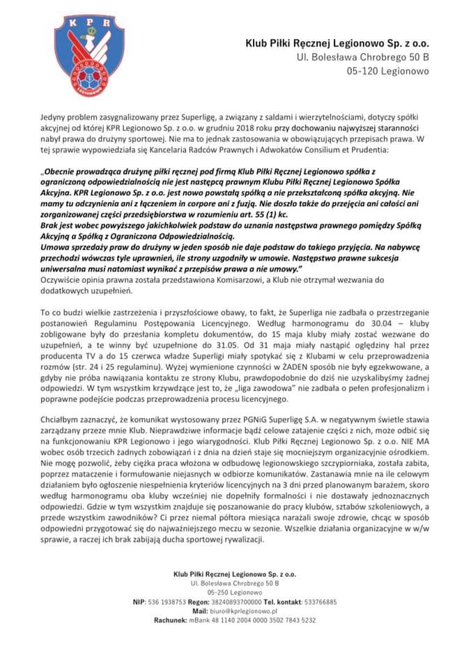 – Nie pozwólmy, by brak przestrzegania procedur, utrudnione kontakty i formułowanie niejasnych komunikatów biło w dobre imię Klubu Piłki Ręcznej Legionowo Spółka z ograniczoną odpowiedzialnością. Dziś nie boimy się przekazać tego, co czuliśmy w ostatnich miesiącach. Zarządzanie sportem, powinno wiązać się z podstawową znajomością i dbałością o to co najważniejsze – o dobro i zdrowie zawodników. To zostało narażone. Być może niepotrzebnie… – napisał Dominik Brinovec na Facebooku.