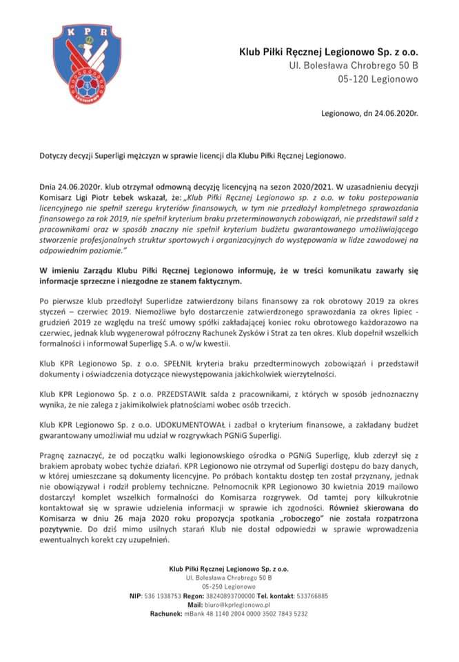 Prezes Zarządu KPR Legionowo wydał oświadczenie w sprawie nieudzielenia licencji na grę w Superlidze w sezonie 2020/2021