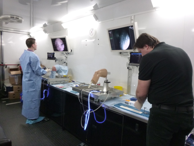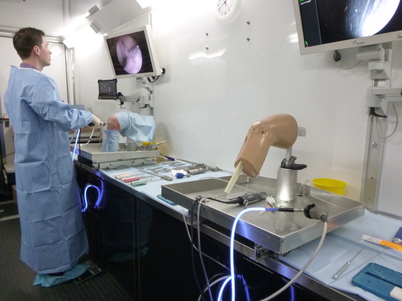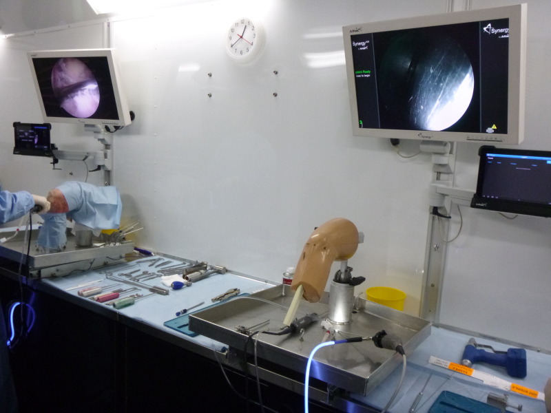 Ciężarówka to laboratorium do szkolenia lekarzy w wykonywaniu zabiegów operacyjnych z zakresu artroskopii stawu kolanowego i stawu barkowego. Artroskopia to minimalnie inwazyjna technika operacyjna, która pozwala na precyzyjną diagnostykę i wykonywanie skomplikowanych procedur chirurgicznych w obrębie uszkodzonych stawów.