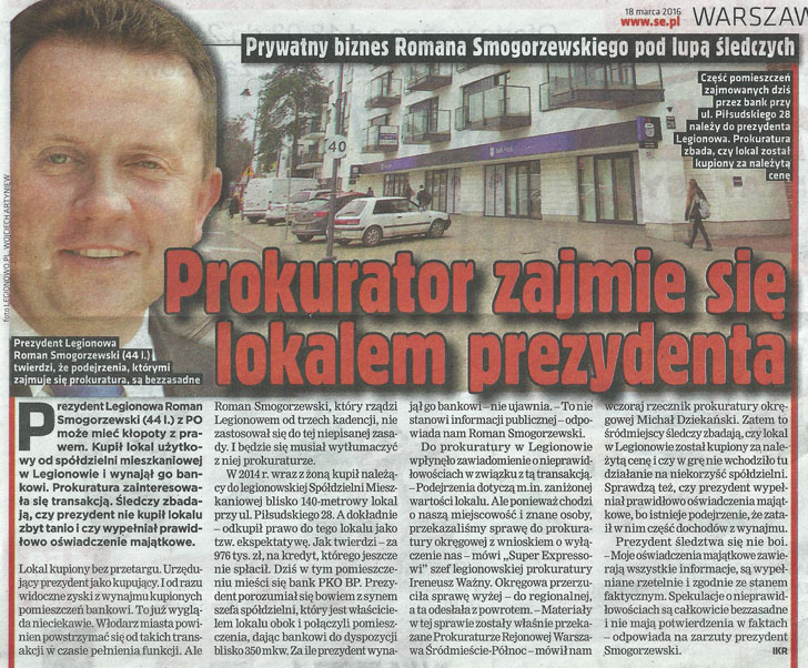 Dziś o najatrakcyjniejszych lokalach w centrum Legionowa, które trafiły w ręce rodzin prezydenta miasta Legionowo Romana Smogorzewskiego oraz Szymona Rosiaka, prezesa SML-W, a jednocześnie Przewodniczącego Rady Powiatu, nie piszemy więc już sami. Sprawą nareszcie zainteresowali się również inni. W Super Expressie Smogorzewski robi nawet za gwiazdę drugi tydzień z rzędu. Poprzednio ogólnopolski dziennik podchwycił od nas temat działki przy ul. Jagiellońskiej, którą prezydent postanowił, bez przetargu, wydzierżawić na 20 lat stowarzyszeniu partyjnej koleżanki, byłej minister edukacji w rządzie PO, Katarzyny Hall.