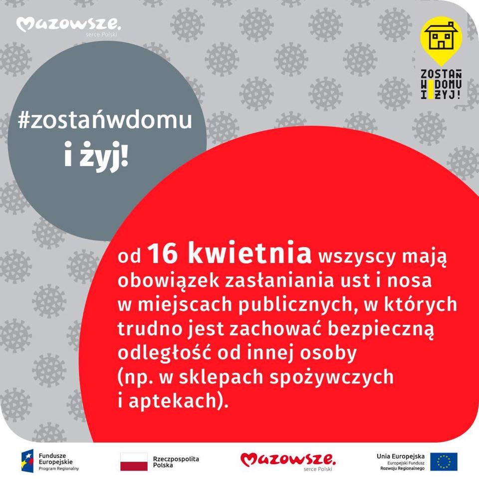 Od 16 kwietnia br. Wszystkich obowiązuje nakaz zakrywania nosa i ust w przestrzeniach publicznych. Najwygodniejszą formą jest maseczka ochronna, ale dopuszczalne jest także zakrycie twarzy np. szalikiem. Ich noszenia ma spowodować, że osoby zakażone koronawirusem, a przechodzące chorobę bezobjawowo, nie będą nieświadomie zarażać innych.