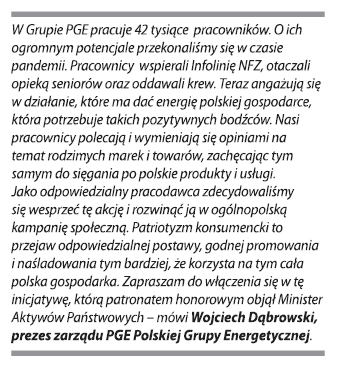 Dostrzegli to pracownicy PGE Polskiej Grupy Energetycznej. W czasie pandemii angażowali się oni w wolontariat, wspierali infolinię NFZ, otaczali opieką seniorów oraz oddawali krew. Szybko jednak zaczęli także polecać sobie krajowe produkty i usługi oraz dzielić się informacjami o nich. Z czasem to wewnątrzfirmowe wsparcie w robieniu zakupów zostało rozszerzone o wskazywanie interesujących miejsc na weekendy i wakacje czy ciekawych wydarzeń kulturalnych.