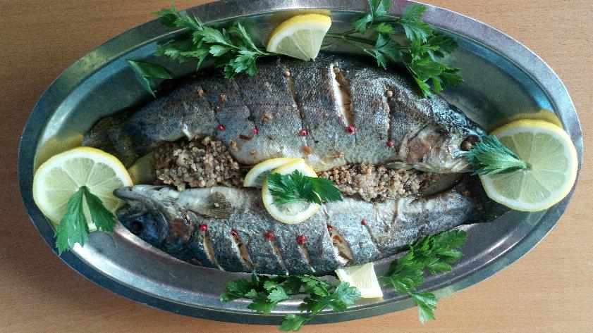 Oczyszczoną tuszkę (wycinamy skrzela i oczy) solimy, posypujemy lekko pieprzem. Do rozciętego brzuszka wkładamy gałązkę zielonej pietruszki i koperku, plaster dobrego masła, plasterek cytryny – wcześniej podsmażony na masełku, na patelni.