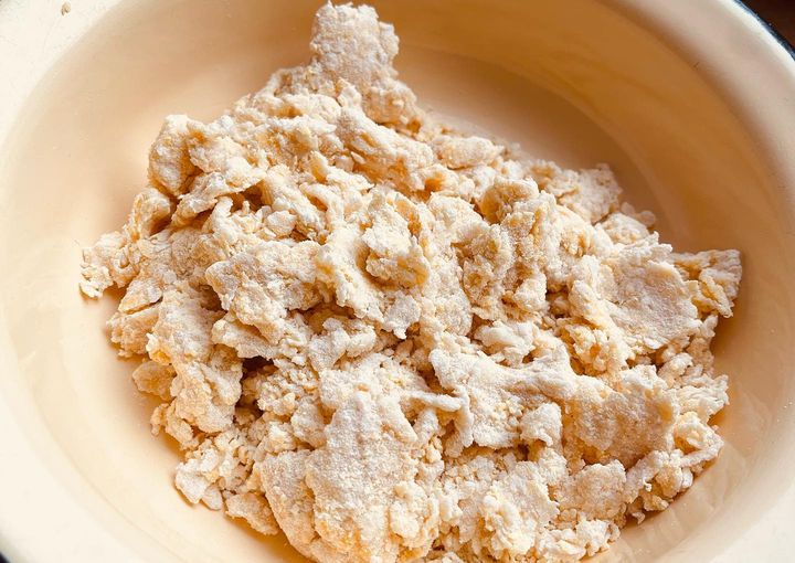 Mleko stawiamy na gaz i podgrzewamy na średnim ogniu. Do miski wsypujemy mąkę, wbijamy jajko i wyrabiamy ciasto na zacierki.